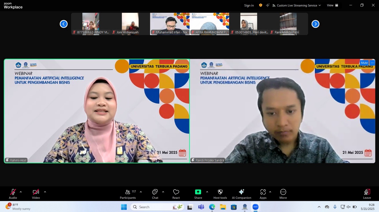 Padang, 21 Mei 2025 — Universitas Terbuka (UT) Padang kembali menunjukkan komitmennya dalam mendukung literasi digital masyarakat dengan menggelar webinar bertema “Pemanfaatan Artificial Intelligence (AI) untuk Pengembangan Bisnis”. Acara ini diselenggarakan secara daring dan diikuti oleh ratusan peserta dari berbagai latar belakang profesi dan wilayah di Indonesia.